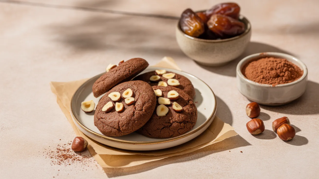 Dates bring a deep caramel sweetness that makes butter-free cookies taste rich and naturally indulgent. When blended into the dough, they create a soft, chewy texture that pairs beautifully with cocoa and toasted hazelnuts. These cookies are perfect if you want a refined-sugar-light option that still delivers big flavor and a satisfying bite.