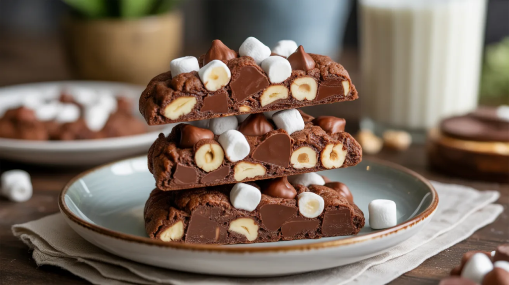 Rocky road style cookies are fun, messy, and perfect for photos. The base is rich double chocolate, and the hazelnuts add crunch while mini marshmallows create gooey pockets without needing butter. This is a great cookie idea when you want something that feels like a special treat—like a dessert bar turned into a handheld cookie.