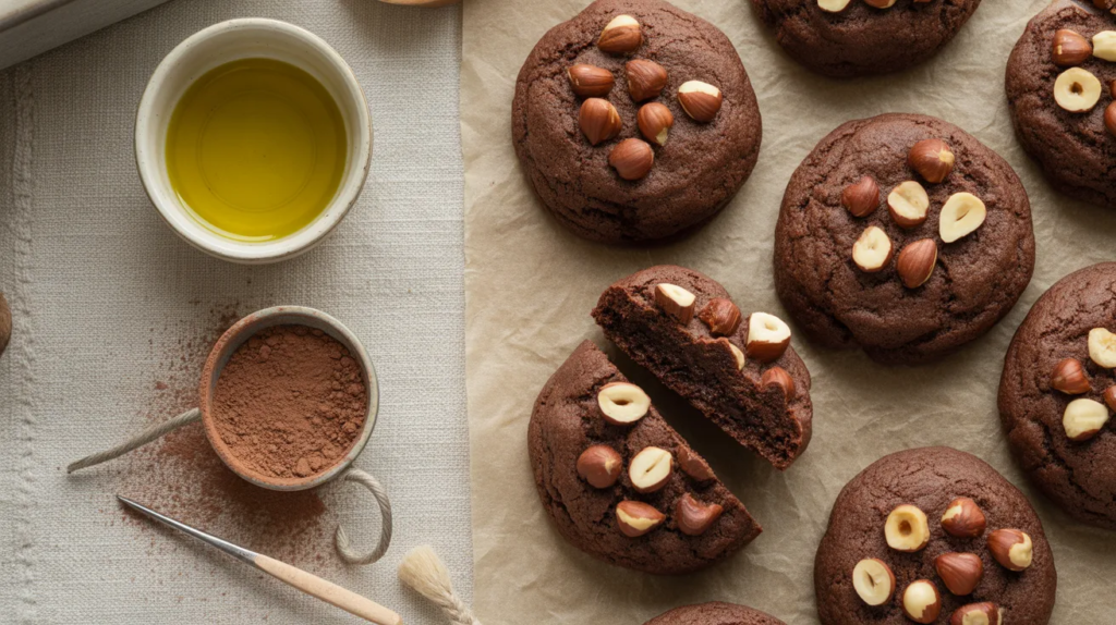 Keep cookie size small so they cook evenly. Chill the dough for a few minutes if it’s soft, then space them out so air can circulate. Add a few hazelnut pieces on top for a pretty finish. In minutes, you’ll have warm, butter-free cookies that feel bakery-fresh.1) Olive Oil Chocolate Hazelnut Chunk Cookies
