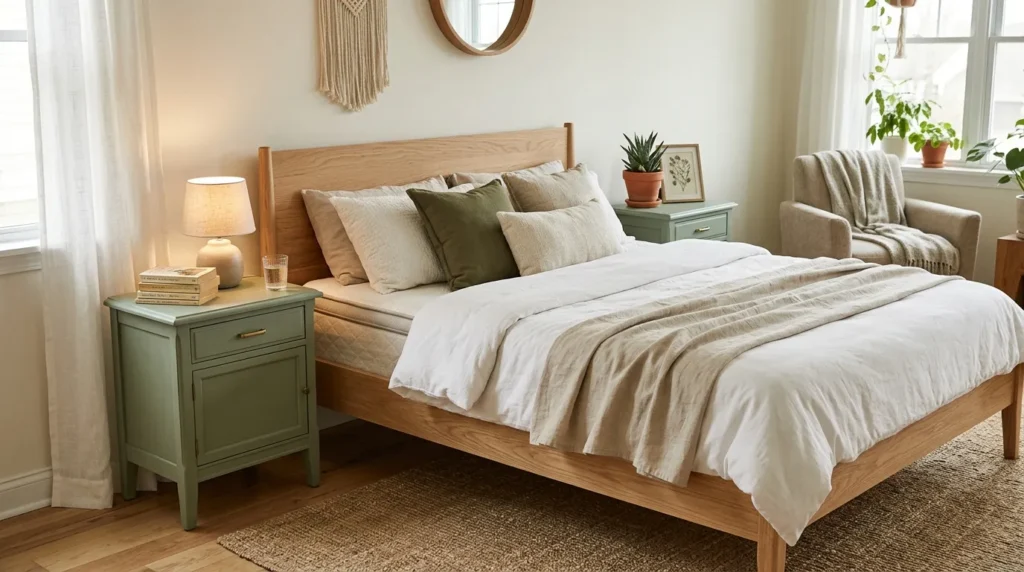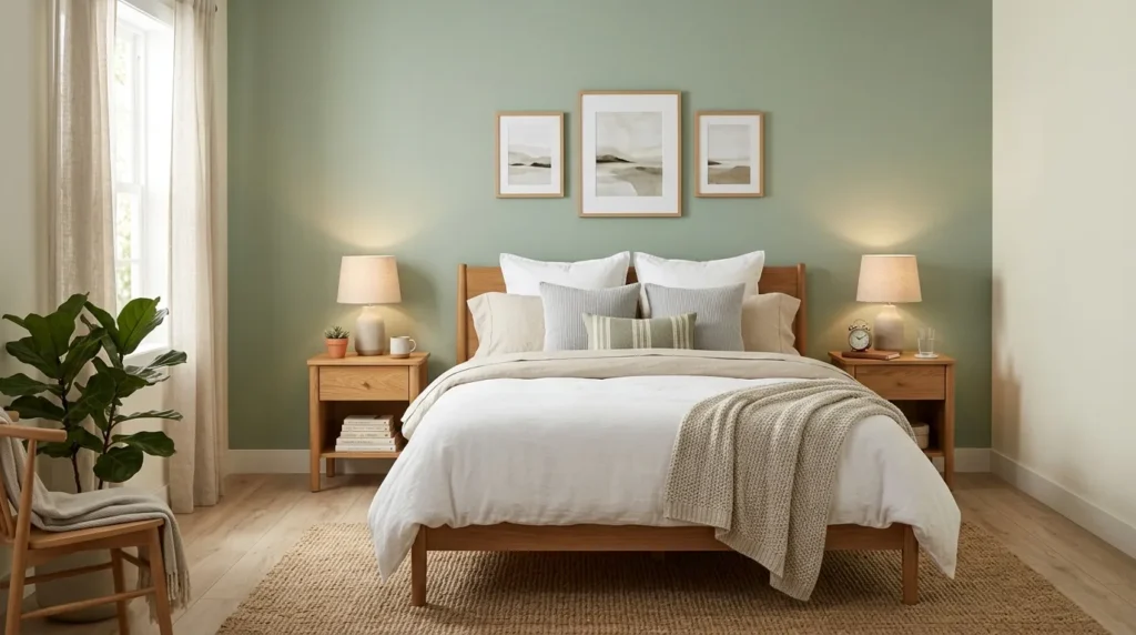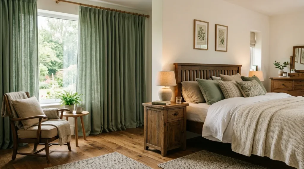 Paragraph 2: Adding neutral rugs, linen curtains, and soft lighting balances the tones. Wood and sage together create a grounded, inviting bedroom atmosphere.