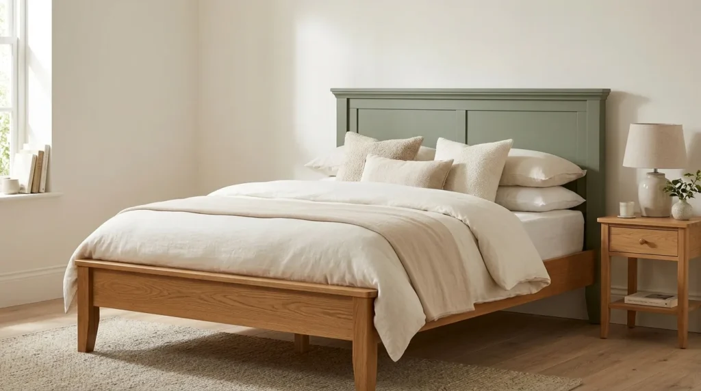 4. Wooden Bed Frame with Sage Accents