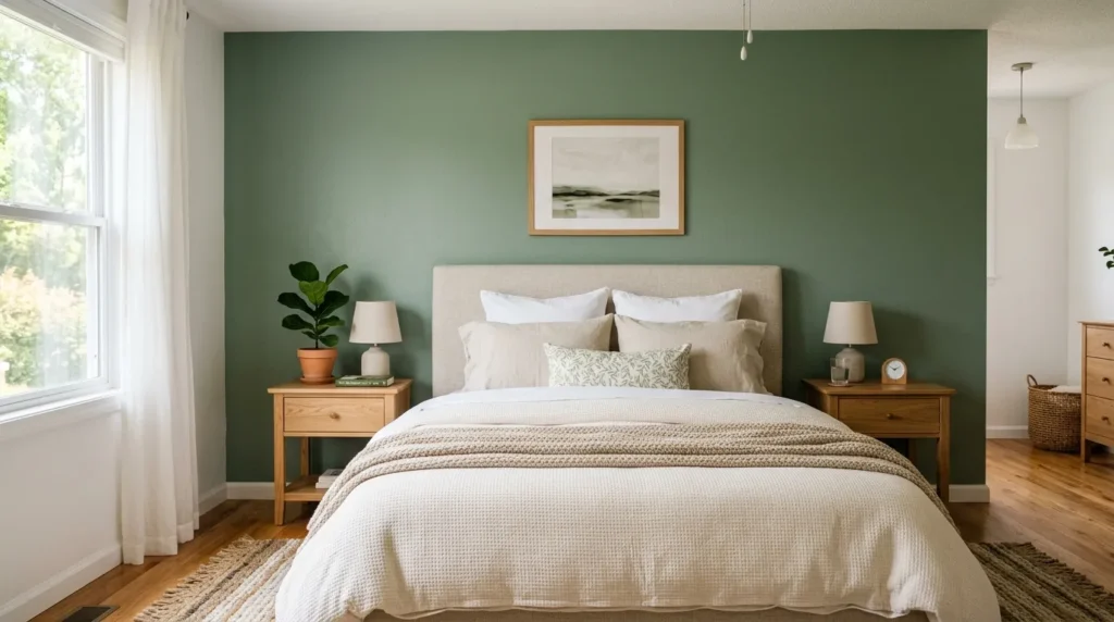 Paragraph 1: A sage green accent wall introduces a calming focal point while keeping the space fresh and serene. It pairs beautifully with light-colored furniture and soft textures.