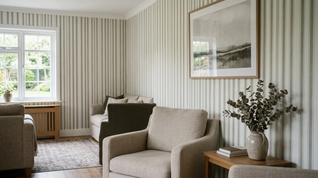 Paragraph 2: Coordinating with neutral furniture, soft bedding, and ambient lighting maintains cohesion. Striped walls introduce subtle detail without overwhelming the serene vibe.