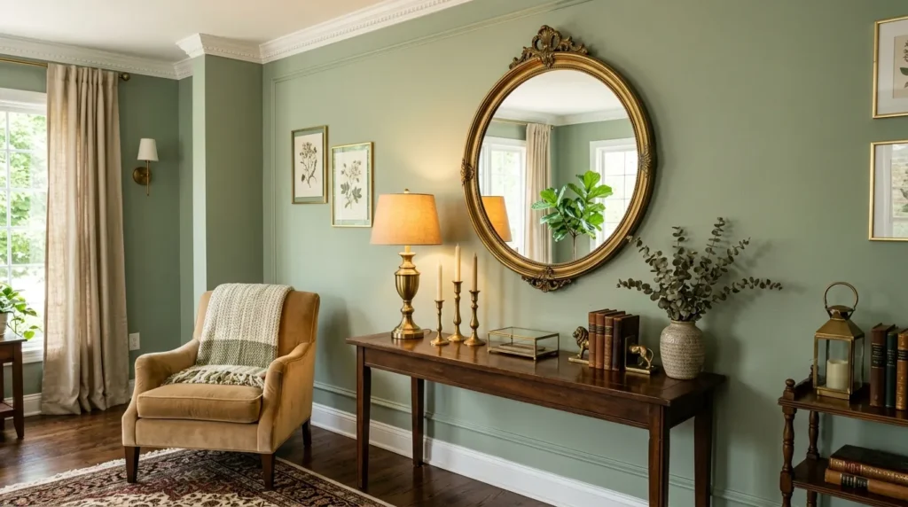 11. Sage Green Walls with Metallic Accents