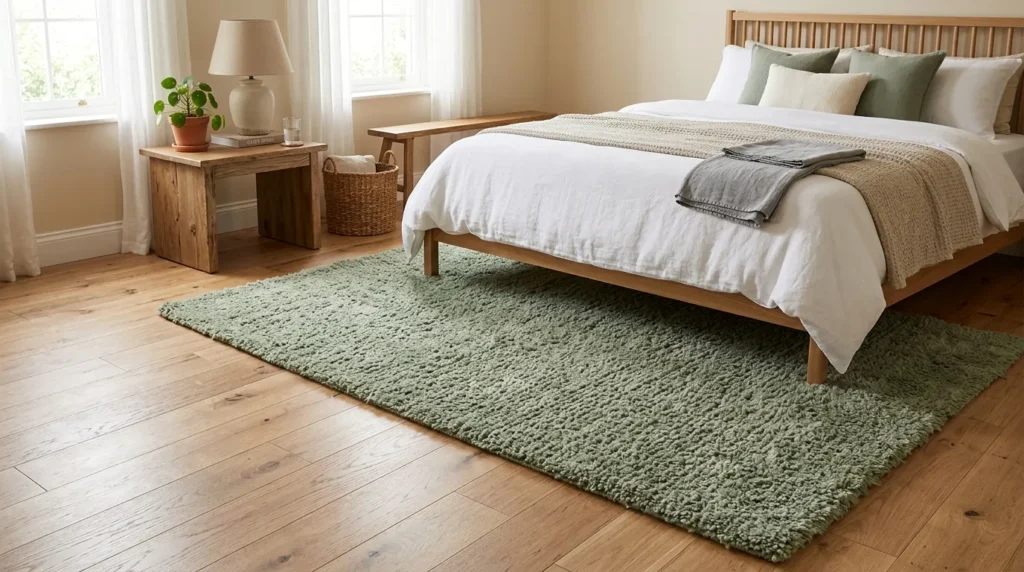 Paragraph 1: A rug grounds the bedroom and adds a soft, calming layer. Sage green enhances serenity and complements other furnishings.