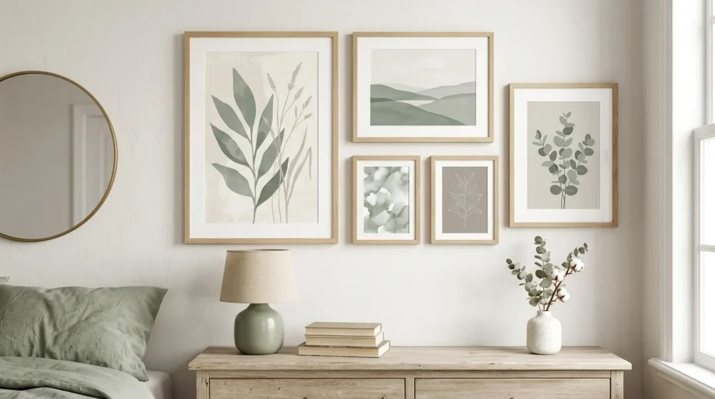 Paragraph 1: Art in sage tones introduces subtle color and personality. It reinforces the bedroom palette and promotes relaxation.
