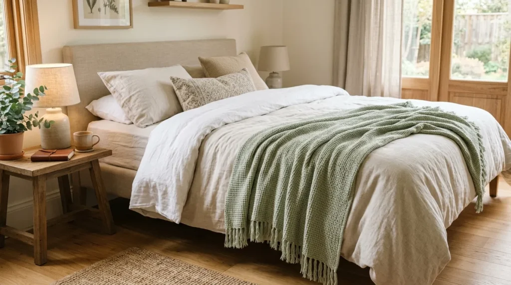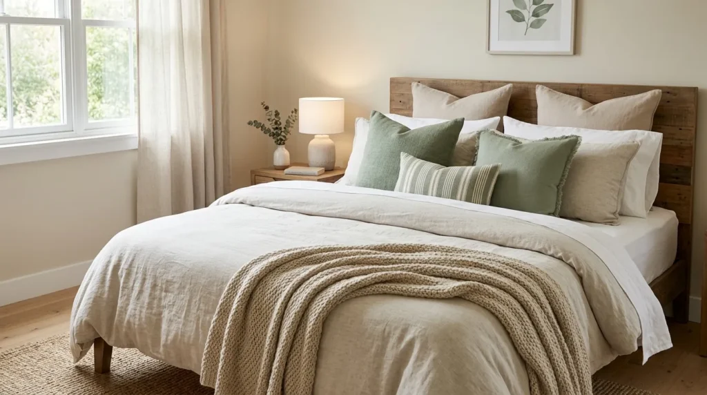 Paragraph 1: Sage green bedding softens the room and promotes restfulness. Layering textures adds visual interest and comfort without overwhelming the space.