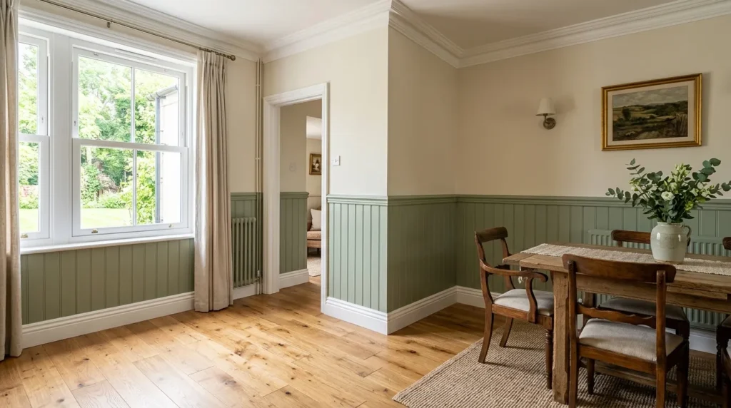 Paragraph 1: Wainscoting adds texture, depth, and architectural interest while complementing sage tones. The design maintains a calm and structured feel.