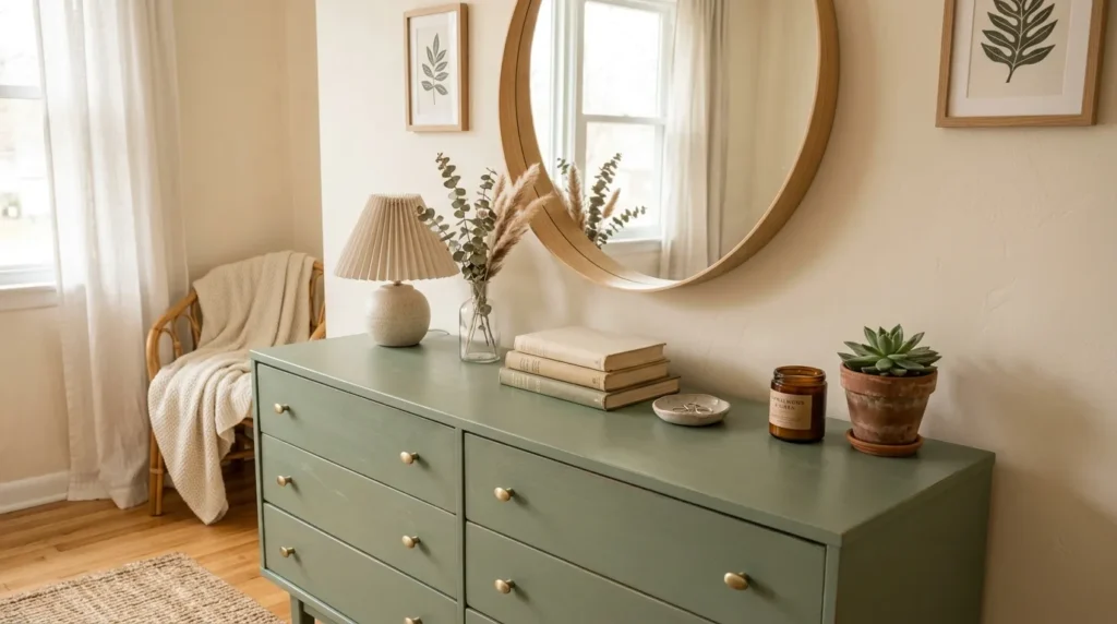Image: Low dresser painted sage green, paired with a neutral mirror and soft accents.