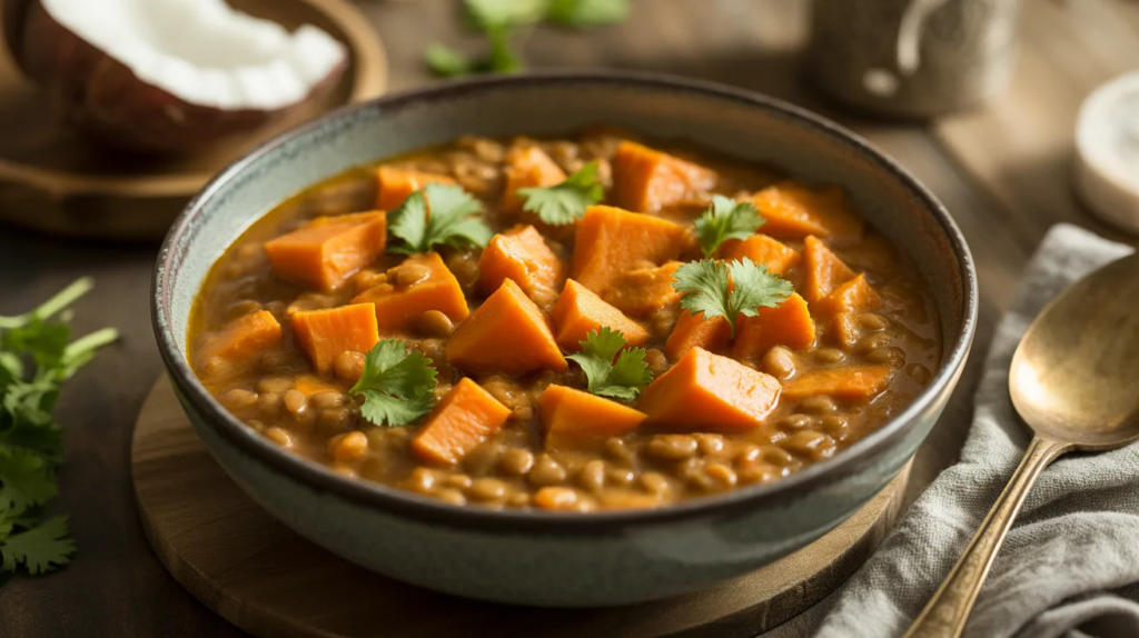 3) Sweet Potato Coconut Lentil Curry (Soft + Comforting)