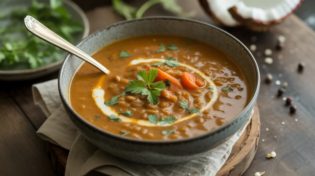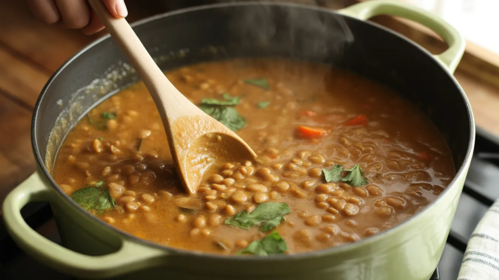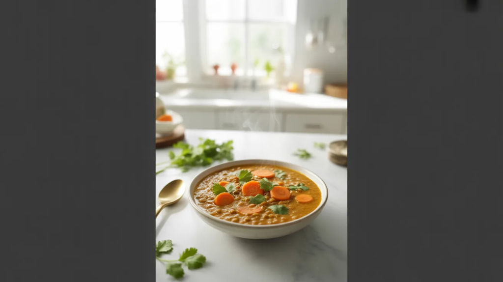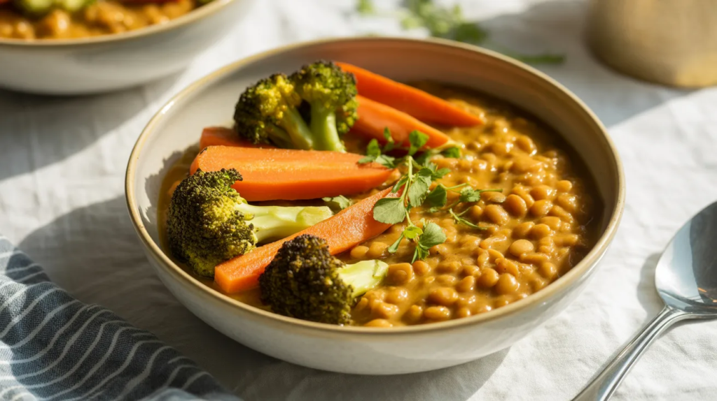If you prefer a lighter dinner, make it soup-style by adding extra vegetable broth. It becomes a cozy coconut lentil curry soup that’s still filling but easier to sip and digest. Add carrots or spinach for extra color, and keep spices gentle so the broth tastes clean and comforting.