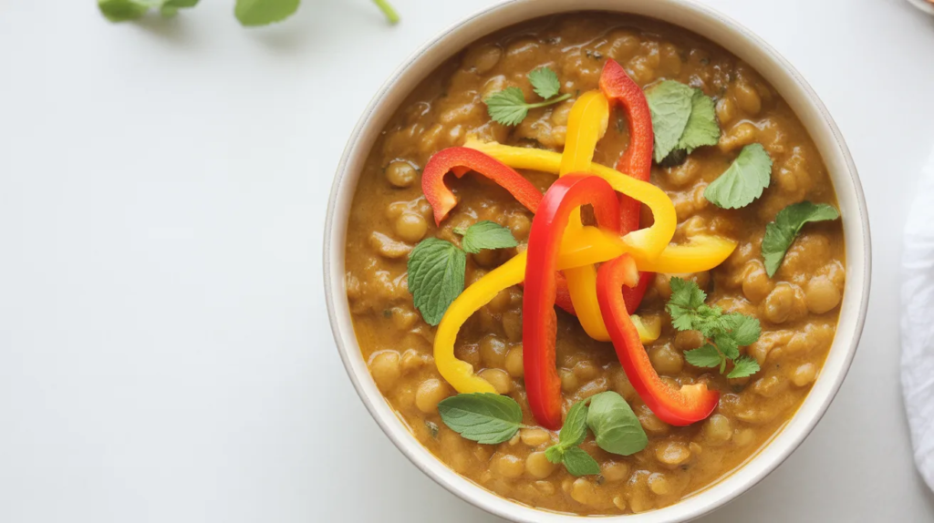 Bell peppers add sweetness, crunch, and color—perfect for a Pinterest-style bowl. Sauté them briefly so they stay slightly crisp, then simmer with coconut milk and lentils for a creamy base. It’s a great easy vegan dinner when you want something fresh-looking but still comforting.