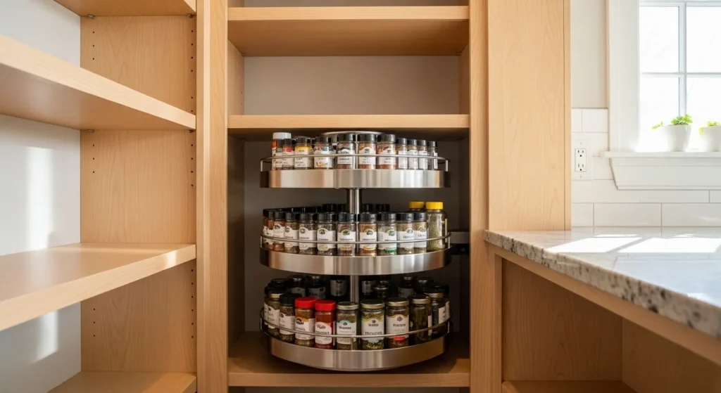 Content: Corner carousels are a fantastic way to utilize corner space, which is often underused in small kitchen pantries. These rotating units allow you to store items such as spices, condiments, and jars in a way that makes them easy to access. The carousel spins, providing access to all items, eliminating the need to move multiple products to reach something at the back. This organization method ensures that every inch of your pantry is efficiently used. By installing a rotating carousel, you can transform an otherwise awkward corner into a valuable storage area. This type of storage system not only keeps your pantry organized but also helps maintain easy access to frequently used items. It’s a practical and space-saving solution for small kitchen pantry ideas.
