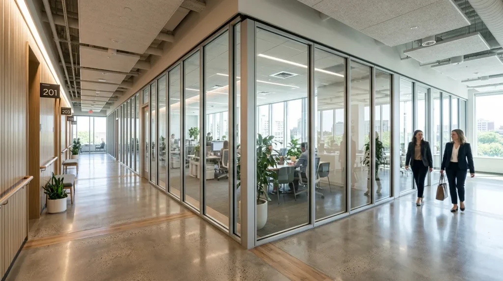 Paragraph 1: Glass panels increase transparency, allowing light to enter and visually enlarging narrow corridors. They create a modern, airy atmosphere.