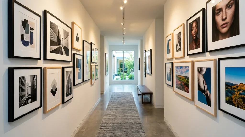 Paragraph 2: Coordinating frames, spacing, and lighting ensures a harmonious composition. This approach adds personality and modern flair to otherwise overlooked hallways.