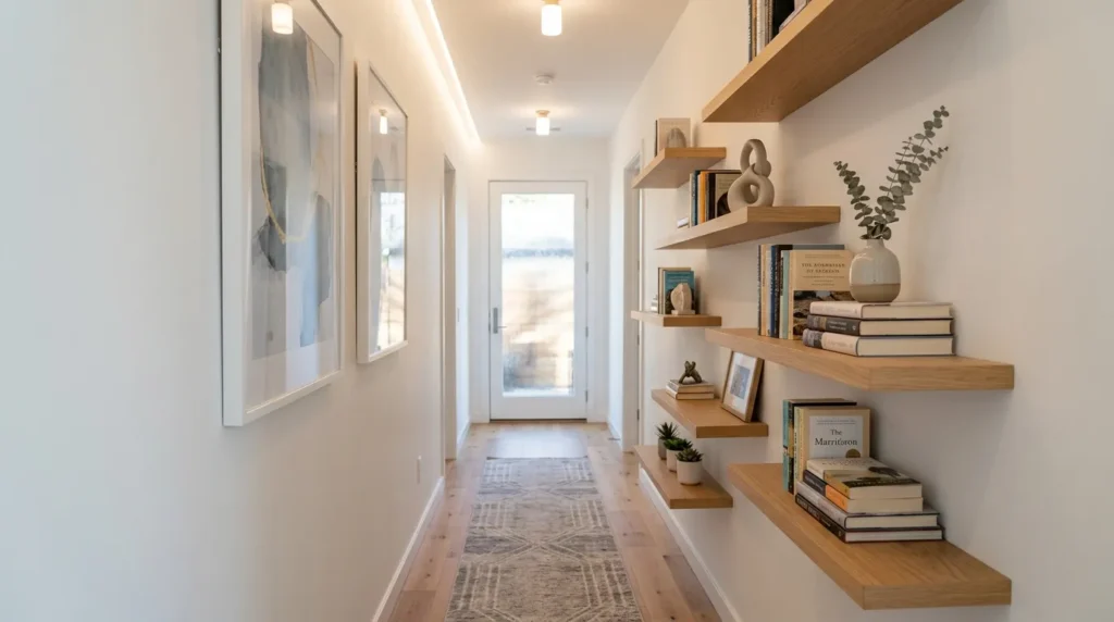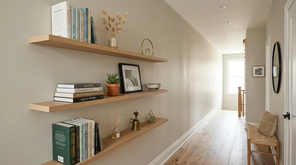 Paragraph 1: Floating shelves provide practical storage while keeping floor space clear, perfect for narrow corridors.