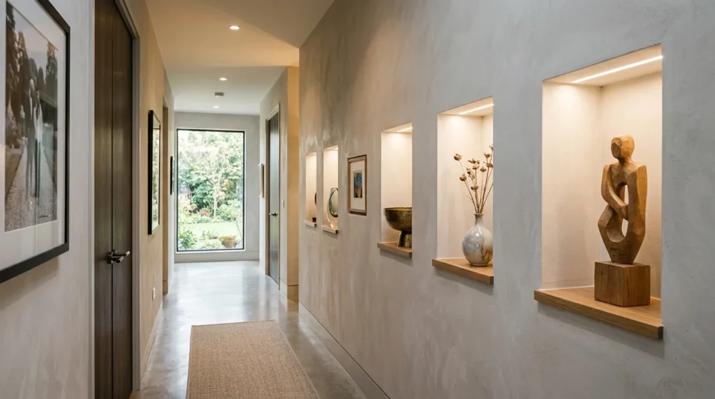 Paragraph 2: Pairing with accent lighting, flooring, and neutral walls ensures balance. Niches add dimension and visual interest in modern hallways.