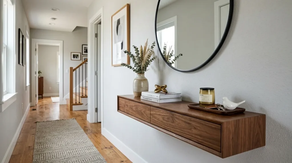 Paragraph 1: Floating consoles save space while providing a functional surface for keys, décor, or mail. They maintain a minimalist look.