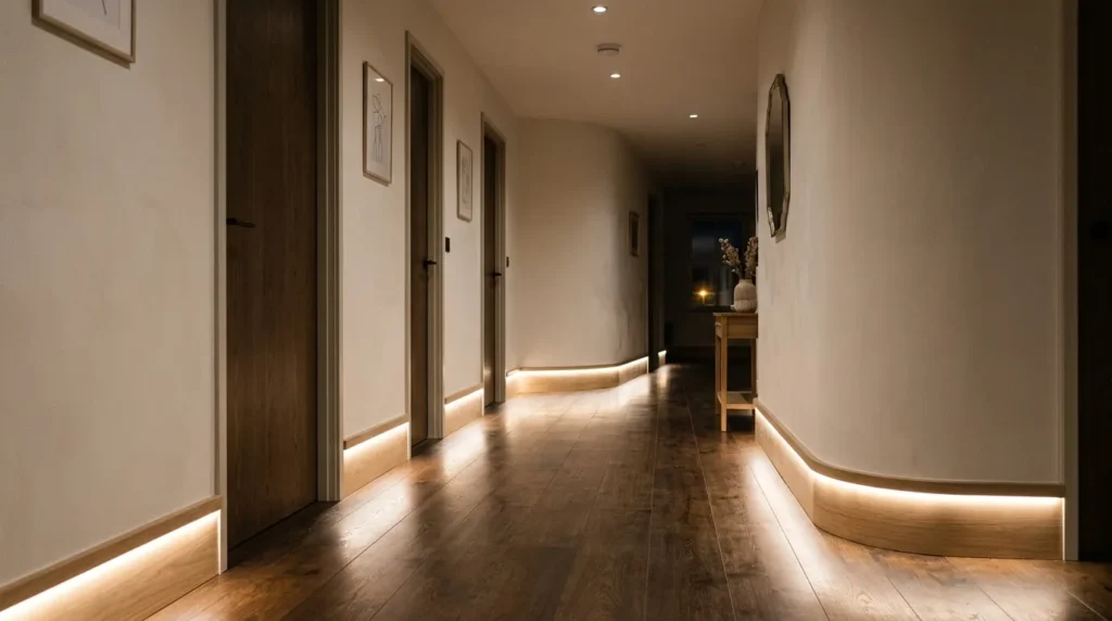 Paragraph 1: Floor-level lighting adds ambiance and safety while emphasizing the corridor’s length. It creates a sleek, contemporary feel.