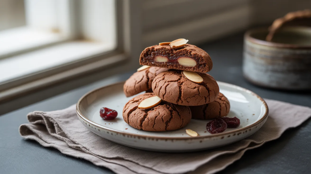 This version tastes like a chocolate-cherry almond truffle in cookie form. Chop dried cherries into small pieces and fold them into the batter with almond flour and cocoa so they distribute evenly. A drop of almond extract boosts that classic amaretti vibe, while vanilla rounds everything out. The cherries soften slightly in the oven, creating chewy little pockets that pop against the crisp, crackled shell.