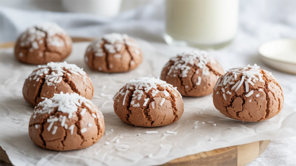 Coconut lovers will adore these “snowcap” amaretti. Fold unsweetened shredded coconut into the almond flour and cocoa mixture for a chewy, lightly tropical texture. The coconut toasts as the cookies bake, adding a warm, nutty aroma that pairs beautifully with chocolate. Roll the dough balls in powdered sugar, then gently press a pinch of coconut on top so it clings and peeks through the crackly surface.