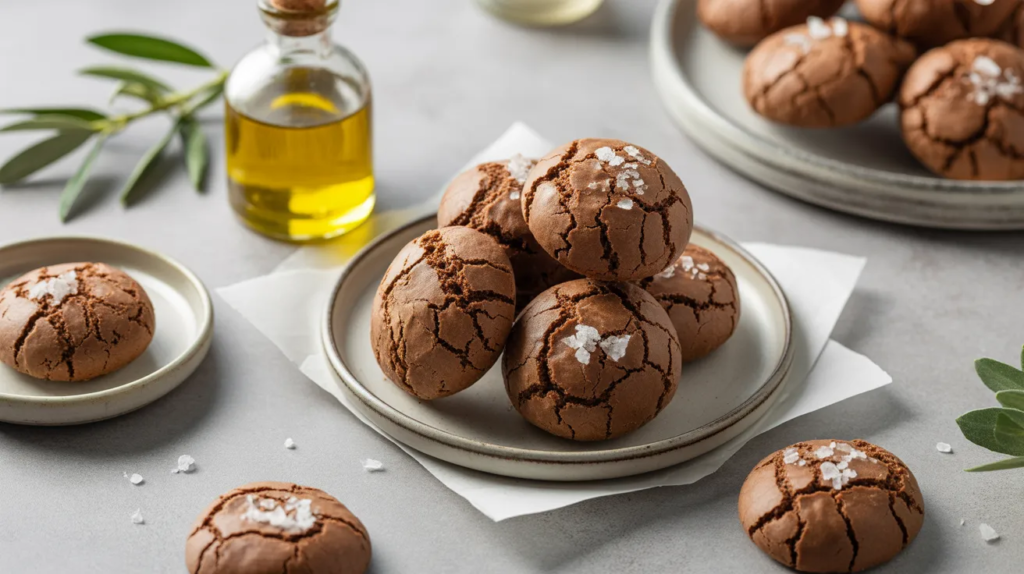 The salt sharpens the cocoa and makes each bite taste more intense without being sweeter. Choose a smooth olive oil you’d enjoy in desserts, not a super bitter one. These cookies look stunning on a neutral plate with dark backgrounds for Pinterest photos. Store airtight, and add the flaky salt right before serving if you want it to stay crisp. They’re amazing with black coffee and feel very “artisan bakery.”