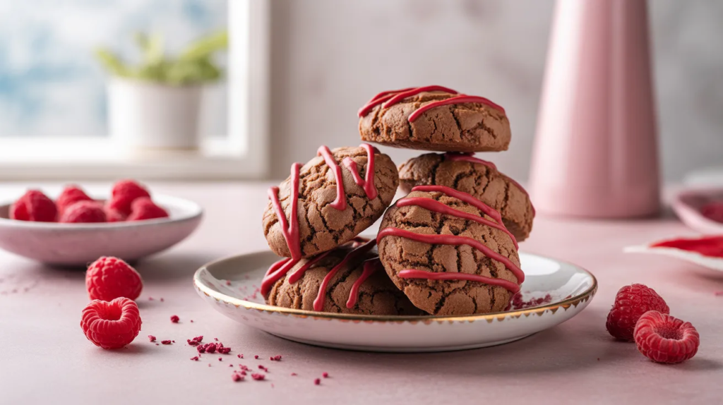 For a “ripple” look, drizzle cooled cookies with a quick raspberry glaze: powdered sugar + a little lemon juice + crushed freeze-dried raspberry powder. If you prefer less sugar, simply melt vegan dark chocolate and dust raspberry powder on top. These are perfect for Valentine’s Day boards or brunch dessert spreads. Store in a cool place so the glaze stays set, and keep parchment between layers to avoid smudging.
