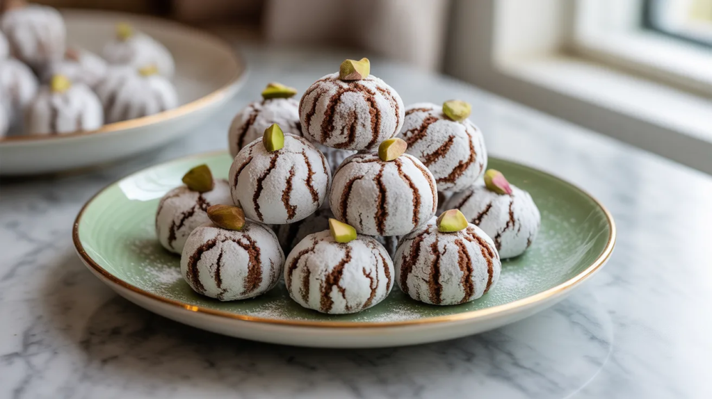 To keep pistachios vibrant, use raw or lightly roasted nuts and chop them right before baking. If you want a stronger pistachio vibe, add a tiny drop of pistachio extract (optional). These cookies look stunning on a dessert board because the green contrasts the white sugar and dark cocoa. Store airtight to keep the nuts crisp, and add an extra sprinkle of pistachios right before serving for fresh crunch.