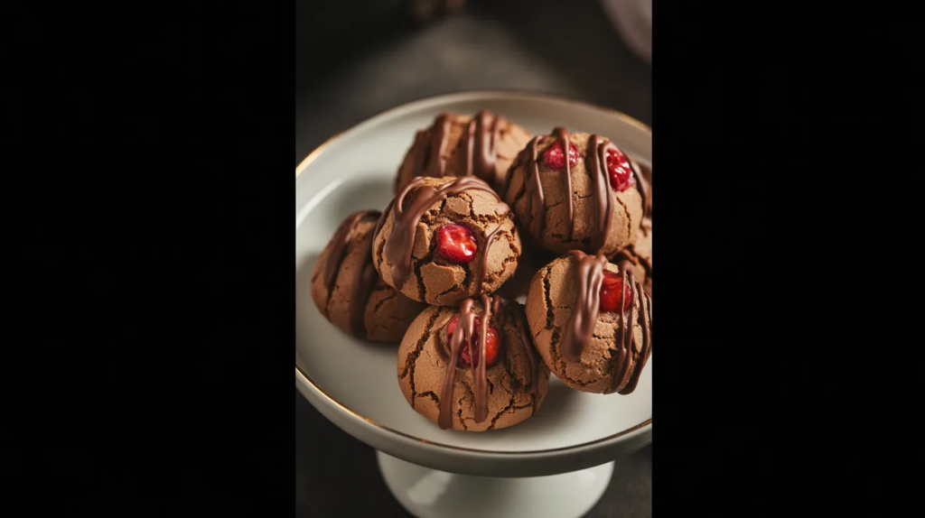 To make them extra “Black Forest,” drizzle with melted vegan dark chocolate and top with a few cherry bits. If you want a cream note, add a small swirl of vegan white chocolate drizzle too. These cookies feel fancy for parties but are still simple to make. Store airtight and separate layers with parchment so drizzles don’t smudge. Serve with coffee or as part of a dessert platter with berries.