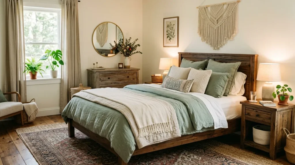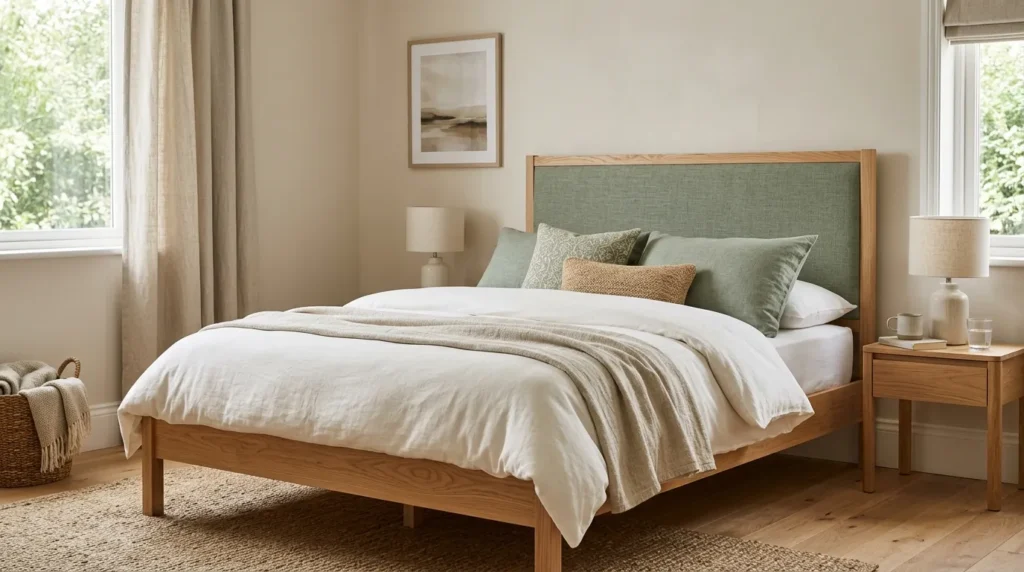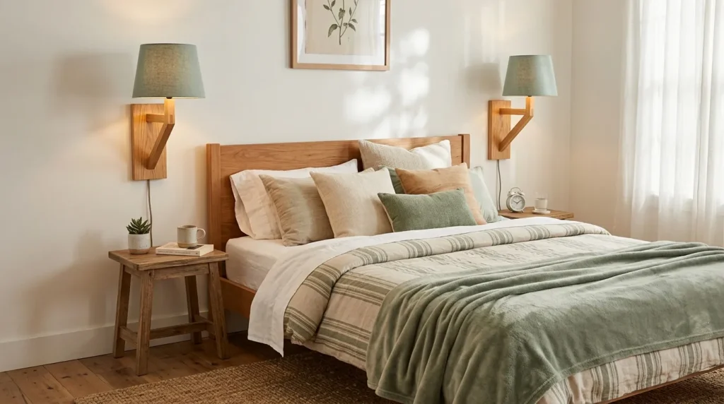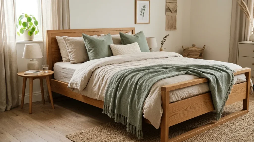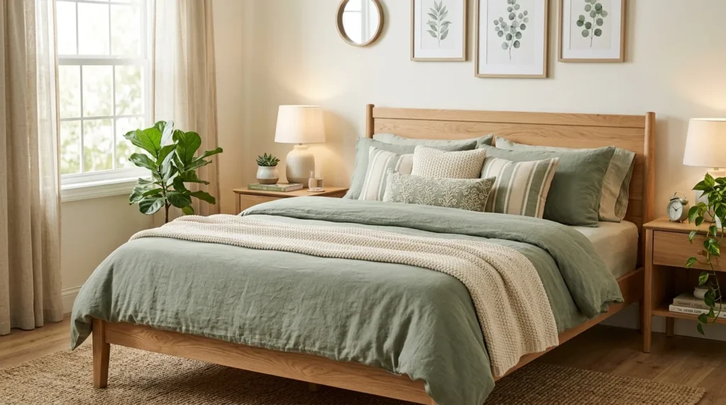 Paragraph 2: Coordinating with pillows, rugs, and lighting maintains harmony. Layered textiles in sage and wood create cozy and inviting bedrooms.
