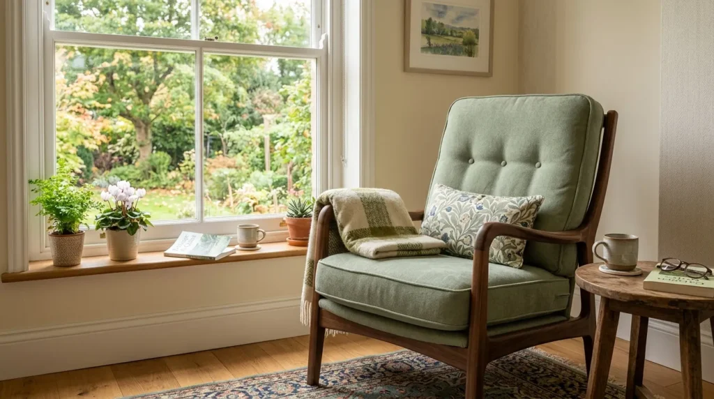 Image: Sage upholstered armchair with wooden frame placed near window.