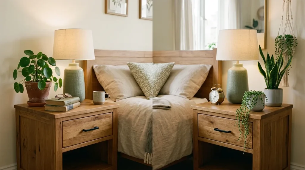 Paragraph 2: Coordinating with bed linens, rugs, and lighting ensures visual balance. Shelves highlight style while maintaining a serene, natural aesthetic.