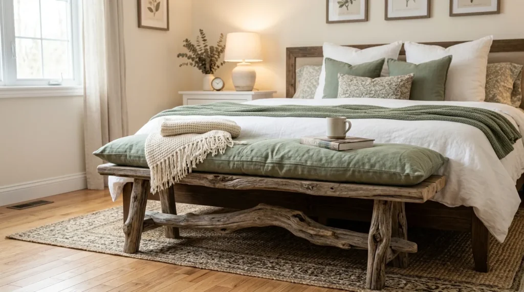 Paragraph 2: Coordinating with bedding, rugs, and lighting ensures balance. Bench with sage accents enhances comfort, warmth, and cohesion in the bedroom.