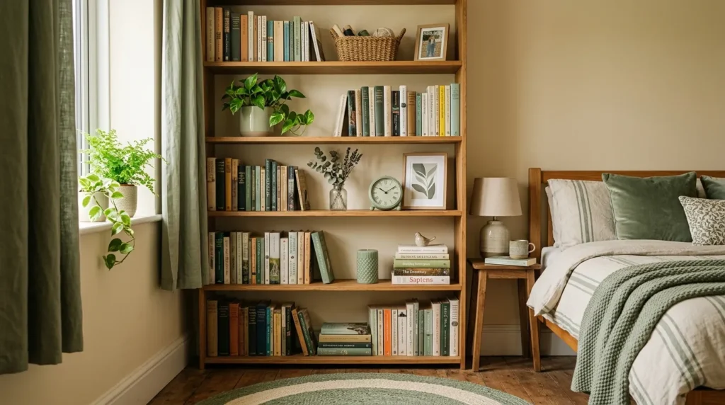 Paragraph 1: Bookcases integrate storage with design. Sage accents on shelves introduce calming tones and enhance visual cohesion.