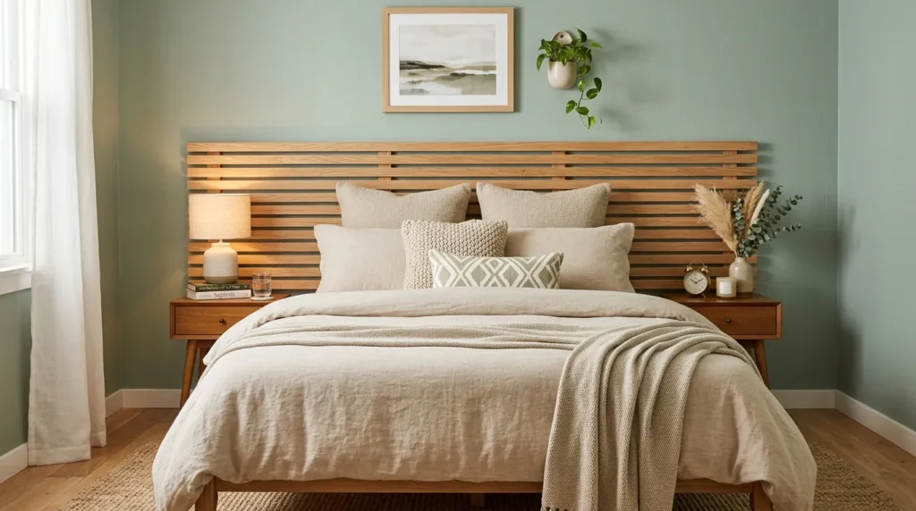 Paragraph 1: Slatted wood adds structure, while sage headboards introduce soft color and comfort. The combination is natural and inviting.