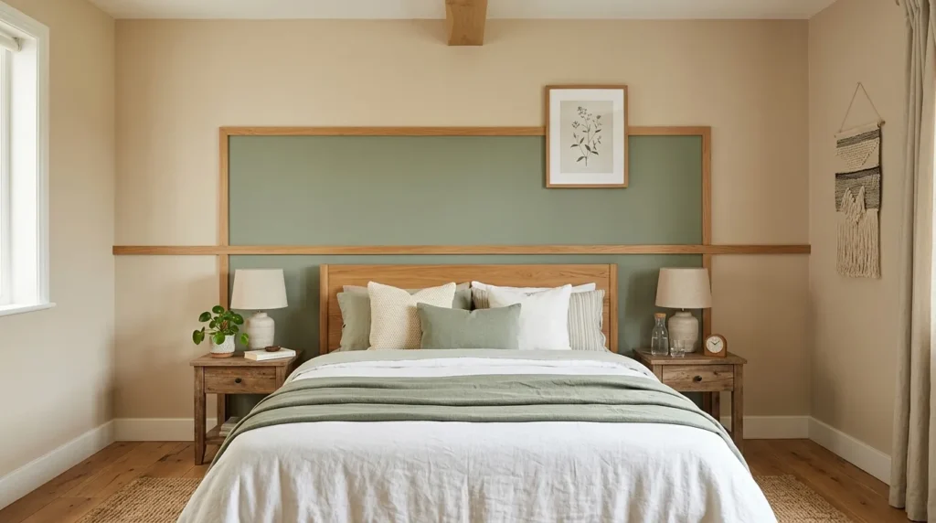 Paragraph 1: A sage green accent wall provides a calming focal point while harmonizing with natural wood tones. It enhances tranquility and balance in the bedroom.