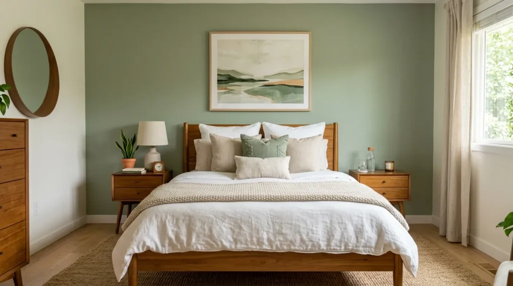 Image: Bedroom with a sage green accent wall behind a wooden bed and neutral bedding.