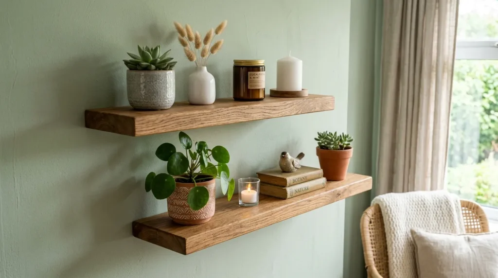 Paragraph 1: Floating shelves offer storage and display while integrating organic textures and greenery. Sage tones enhance relaxation.