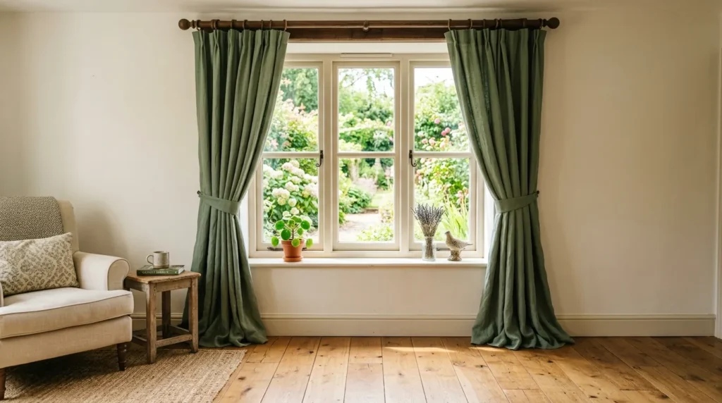 Paragraph 1: Sage curtains filter light softly while introducing natural color, complementing wooden floors for warmth and harmony.