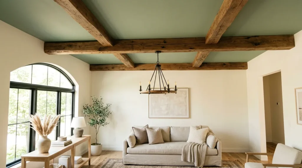 Paragraph 1: Sage ceilings add color subtly, complementing natural wood beams for balance and visual interest.