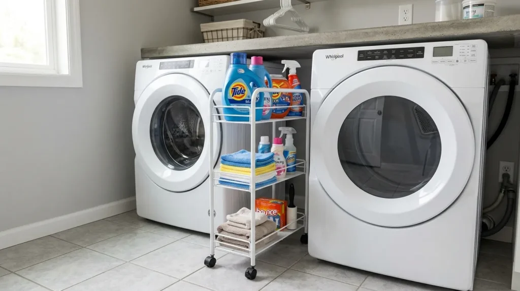 Paragraph 2: Pairing with labeled baskets, matching containers, and compact design keeps the laundry room uncluttered. A mobile cart enhances functionality and efficiency in tight spaces.