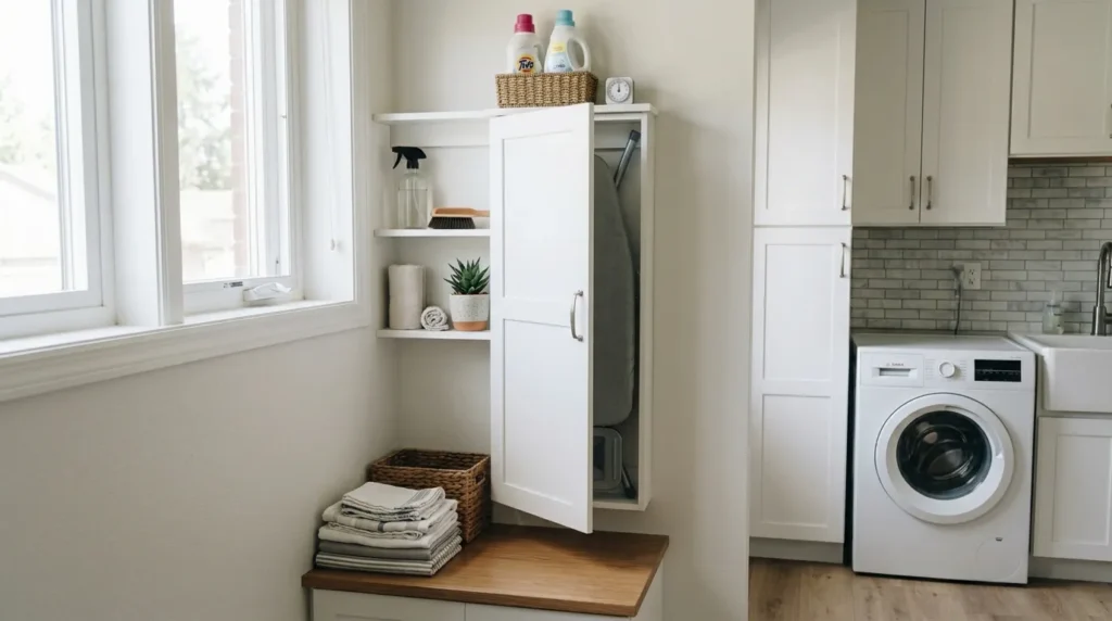Paragraph 2: Pairing with vertical storage and nearby shelves maximizes utility. This design keeps the laundry room functional while minimizing clutter.