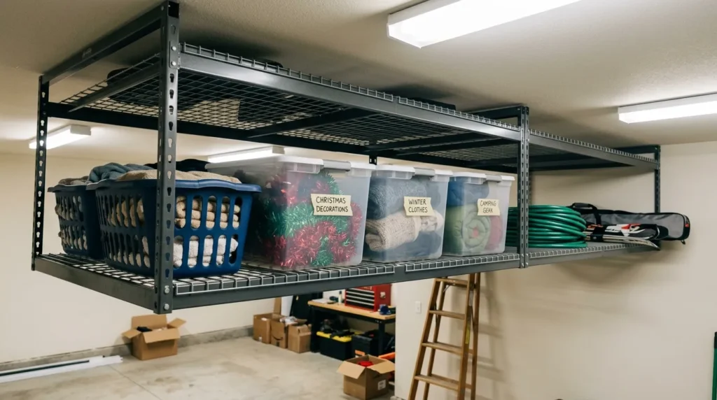 Image: Ceiling-mounted racks for seasonal items or large laundry baskets.