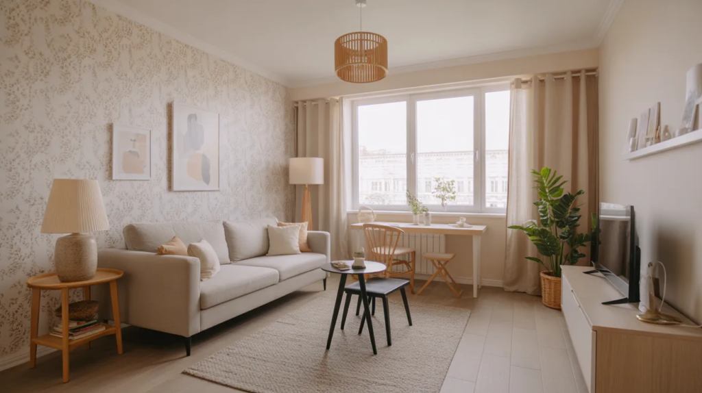 Place it next to a chair or sofa and add a small side table for a styled corner. If you’re tight on space, pick a slim lamp base. This upgrade improves mood, makes evenings more relaxing, and makes the apartment feel more “home.”