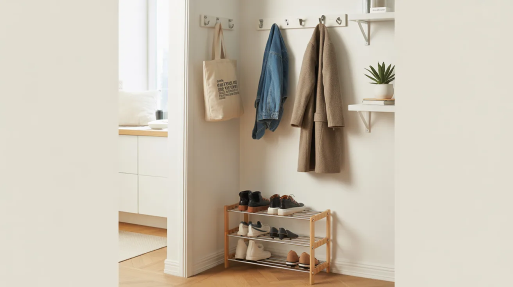 A renter-friendly entry station makes your apartment feel tidy from the moment you walk in. Use Command hooks for coats, bags, and keys, and add a small shoe rack or basket underneath. This keeps clutter off chairs and floors, which instantly makes a small space feel bigger and calmer.