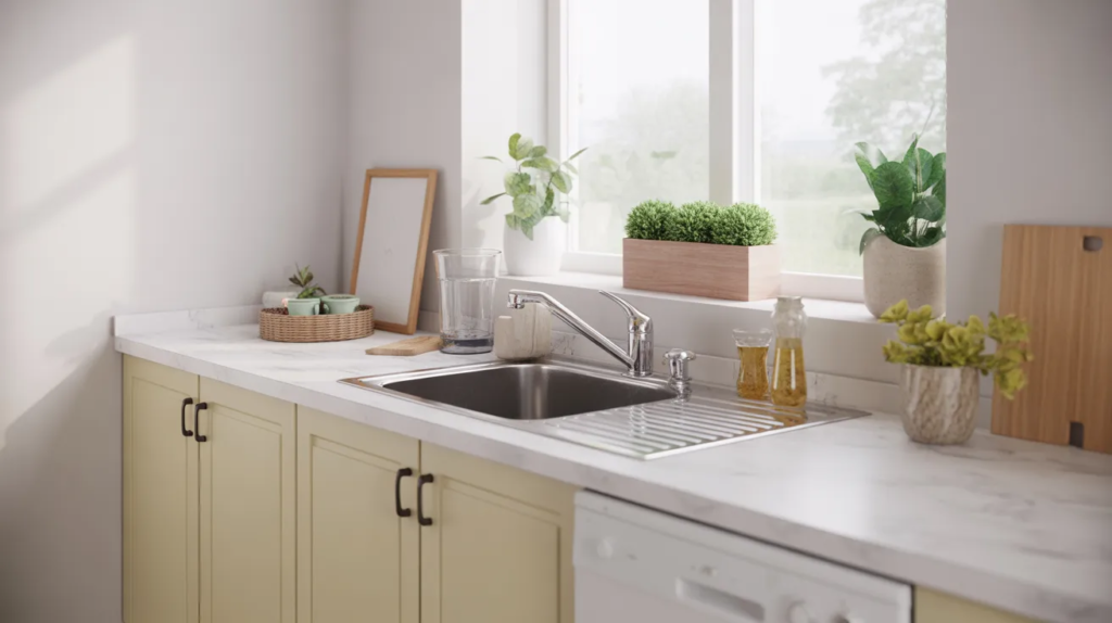 Pair it with matching hardware or a new faucet sprayer if allowed. Add a small tray for soap and a plant for warmth. This idea is perfect for renters who want a “clean, updated kitchen” look without spending on permanent changes.