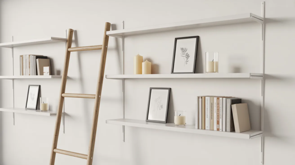 If you want shelving without damaging walls, use adhesive shelves or a leaning ladder shelf. This gives you display space for books, plants, candles, and framed prints without drilling. In small apartments, vertical storage is key, and shelves let you decorate upward so the room feels taller and more styled.