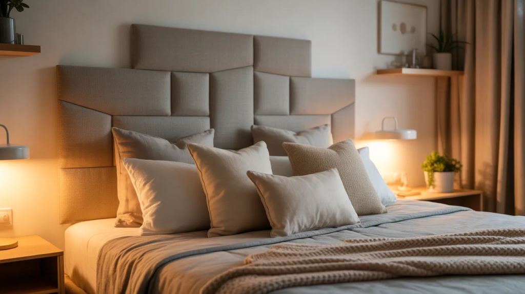 A headboard makes a bedroom look finished, but you don’t need a real one. Use a large pillow headboard, a peel-and-stick upholstered panel, or even fabric hung neatly to create the same effect. This gives your bed a focal point and makes the whole room feel styled without drilling or buying expensive furniture.