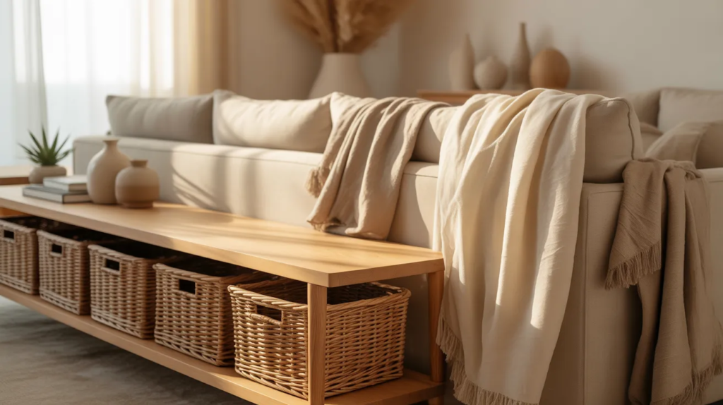 Choose baskets in similar tones so the room stays cohesive. Place them under a console table, next to a sofa, or under open shelving. This is a simple decor trick that makes your space feel organized, cozy, and Pinterest-ready.