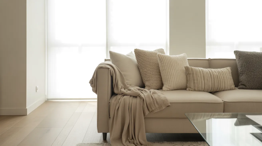 Throw pillows are an affordable way to update your living room without buying new furniture. Pick two or three colors and mix textures like boucle, linen, and knit to make the sofa look more expensive. Use pillow covers instead of full pillows to save money and store extras easily in a small apartment.
